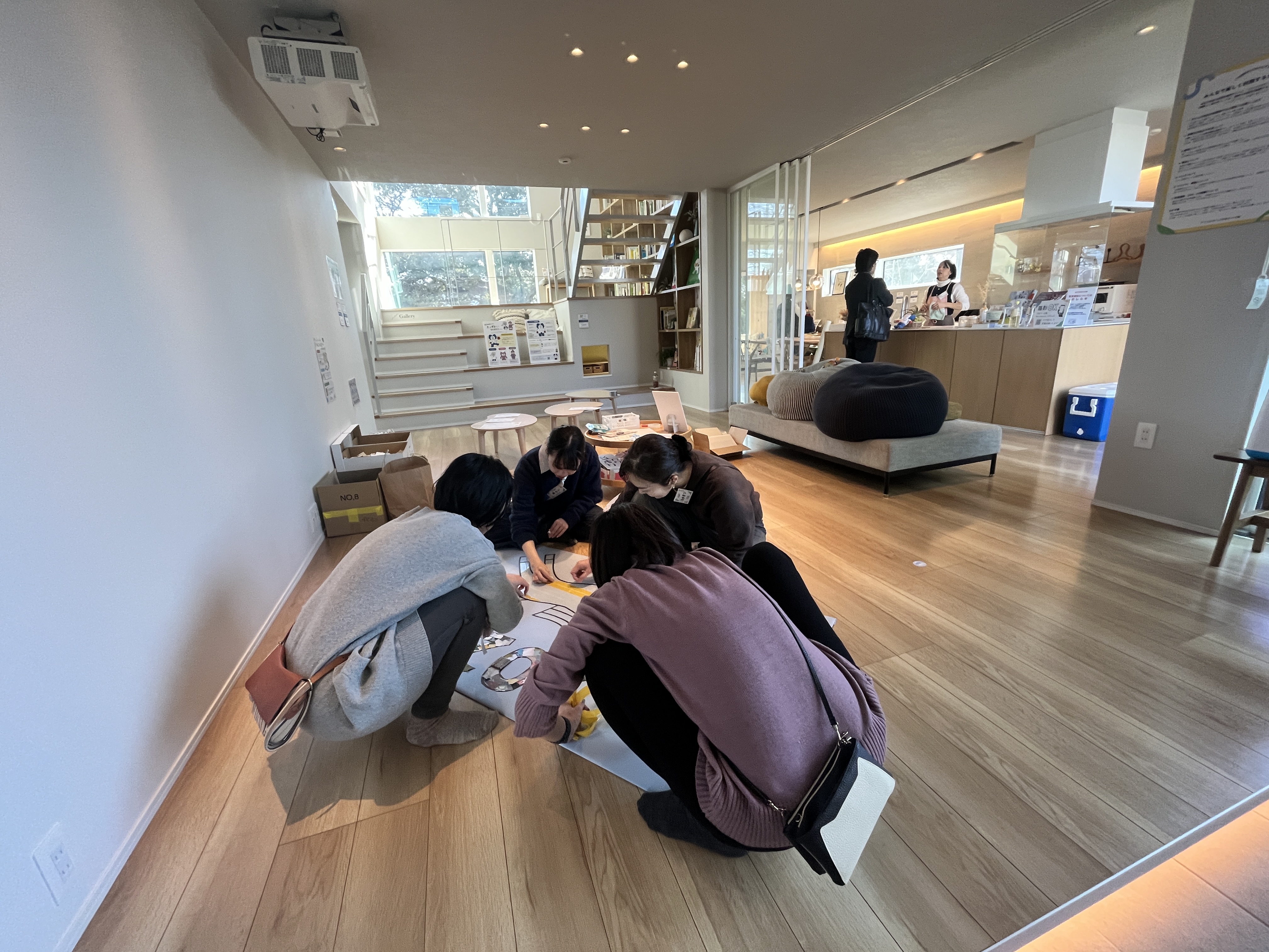 スタッフのみなさんが、床に座って何かしていますね?