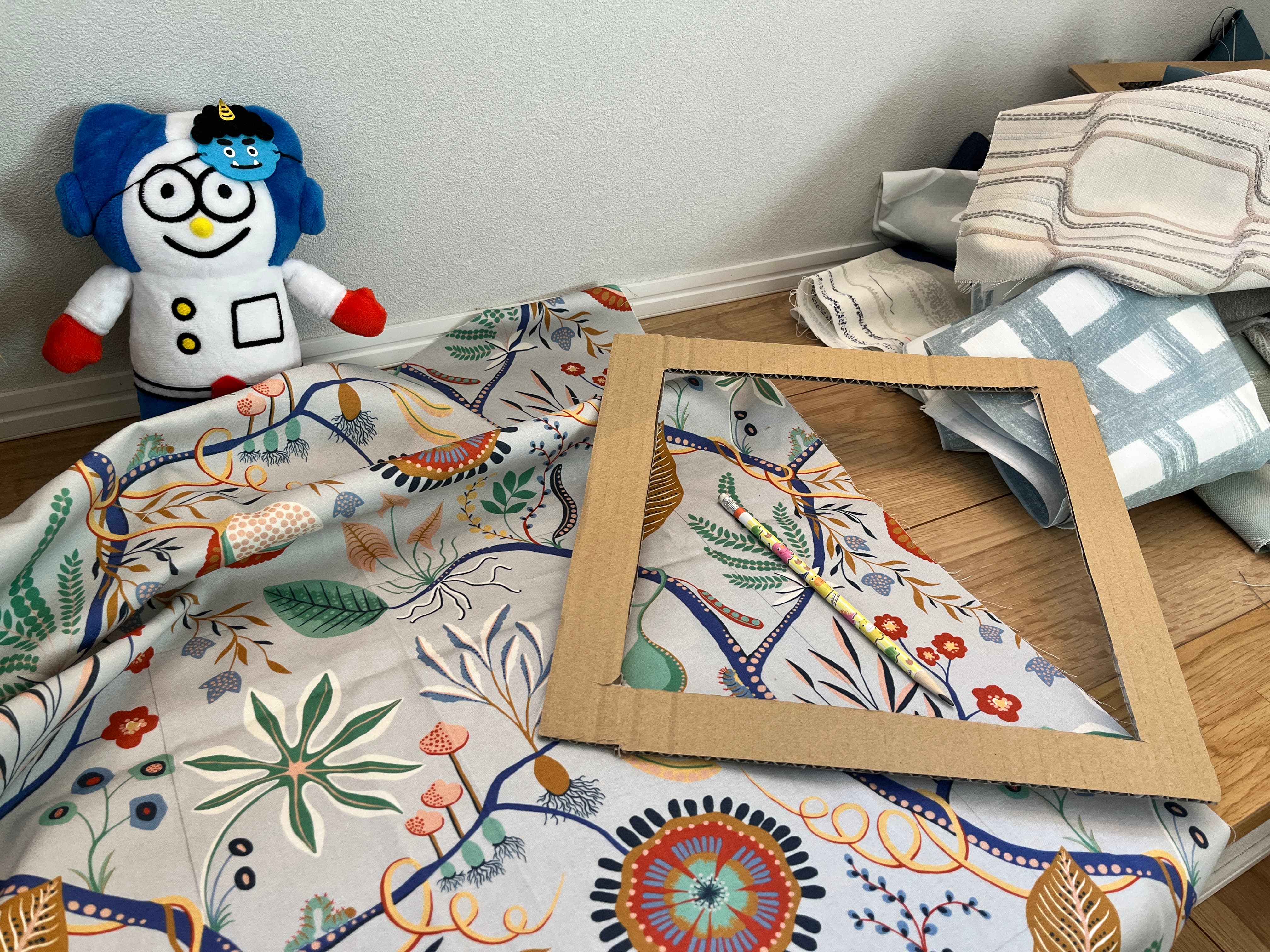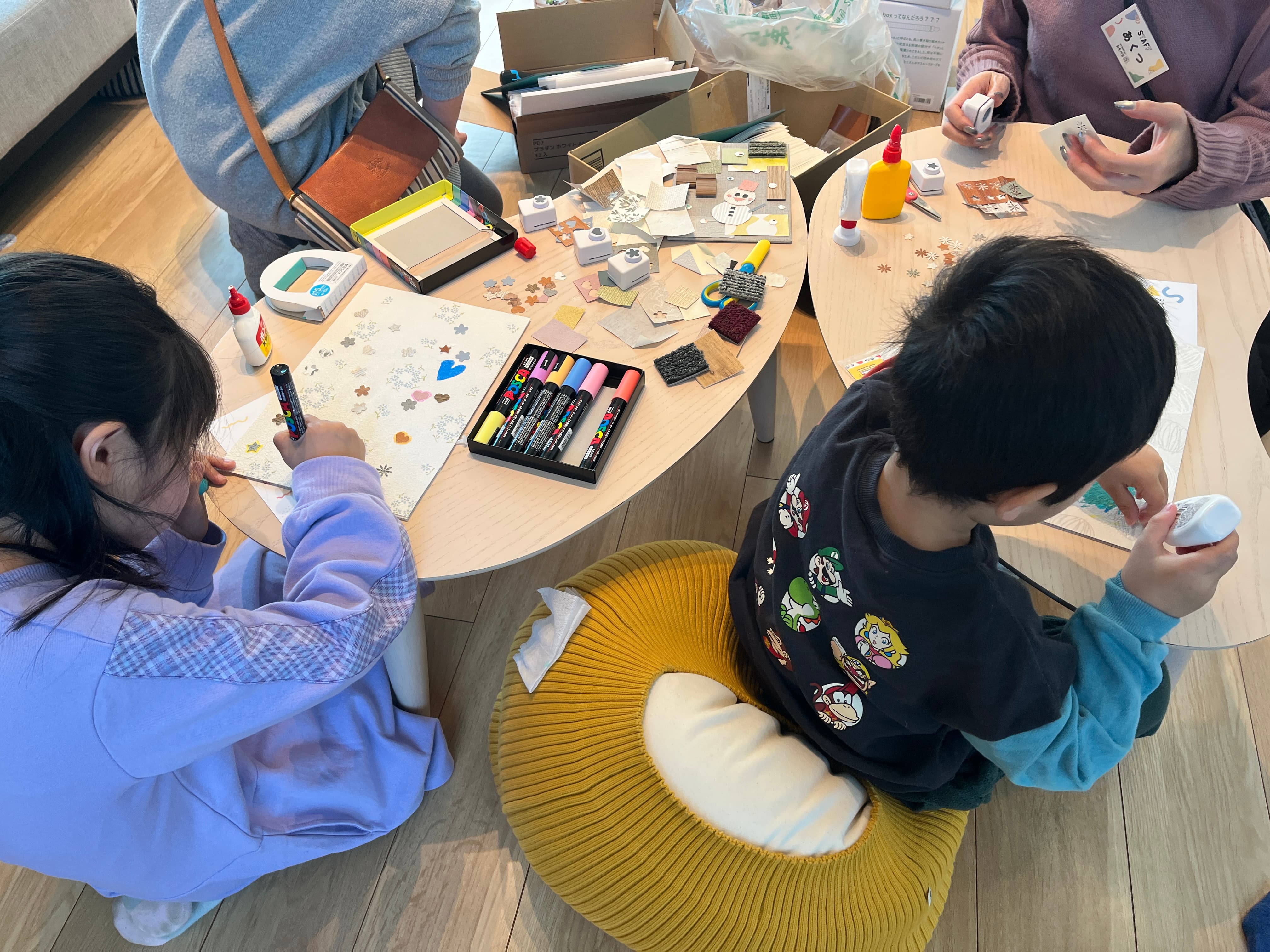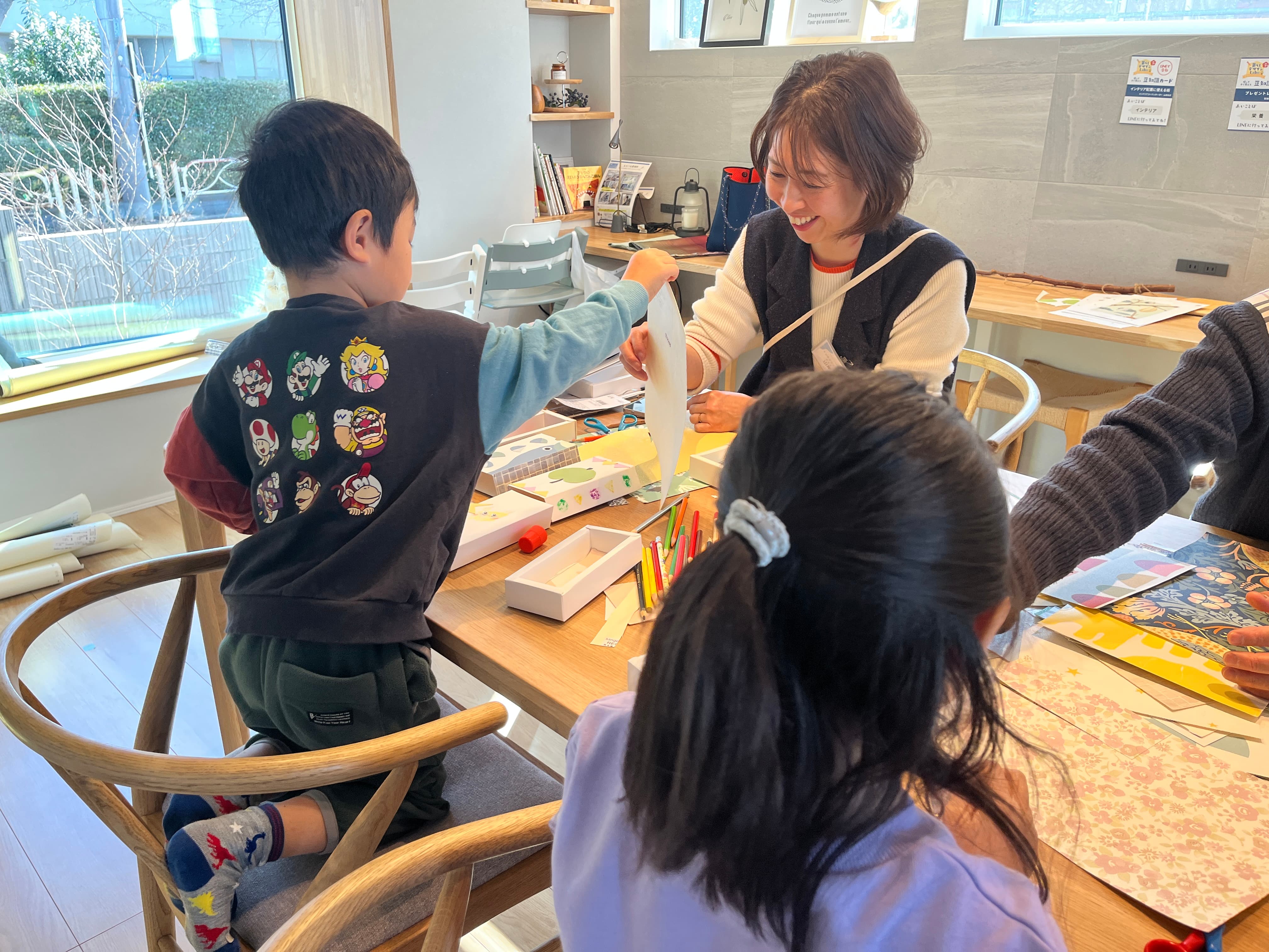 建築端材を使ったワークショップでは、大きなクロスサンプルに小さく切り抜いたクロスを貼り付けたり……