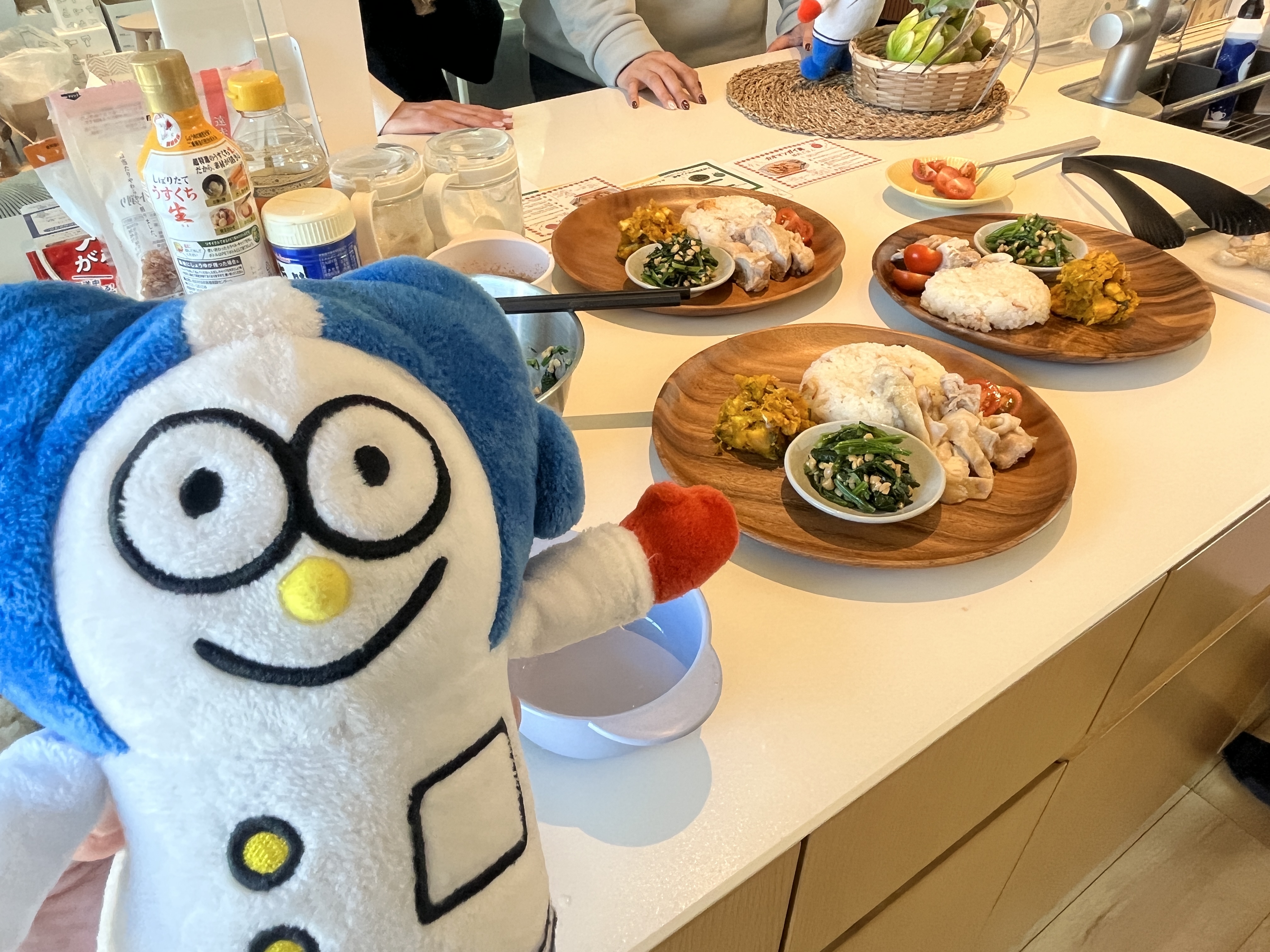 この日のメニューは「カオマンガイ風鶏肉ごはん」「冷凍かぼちゃでチーズ入りおかかサラダ」「冷凍ほうれん草で給食で人気の納豆和え」の3品!