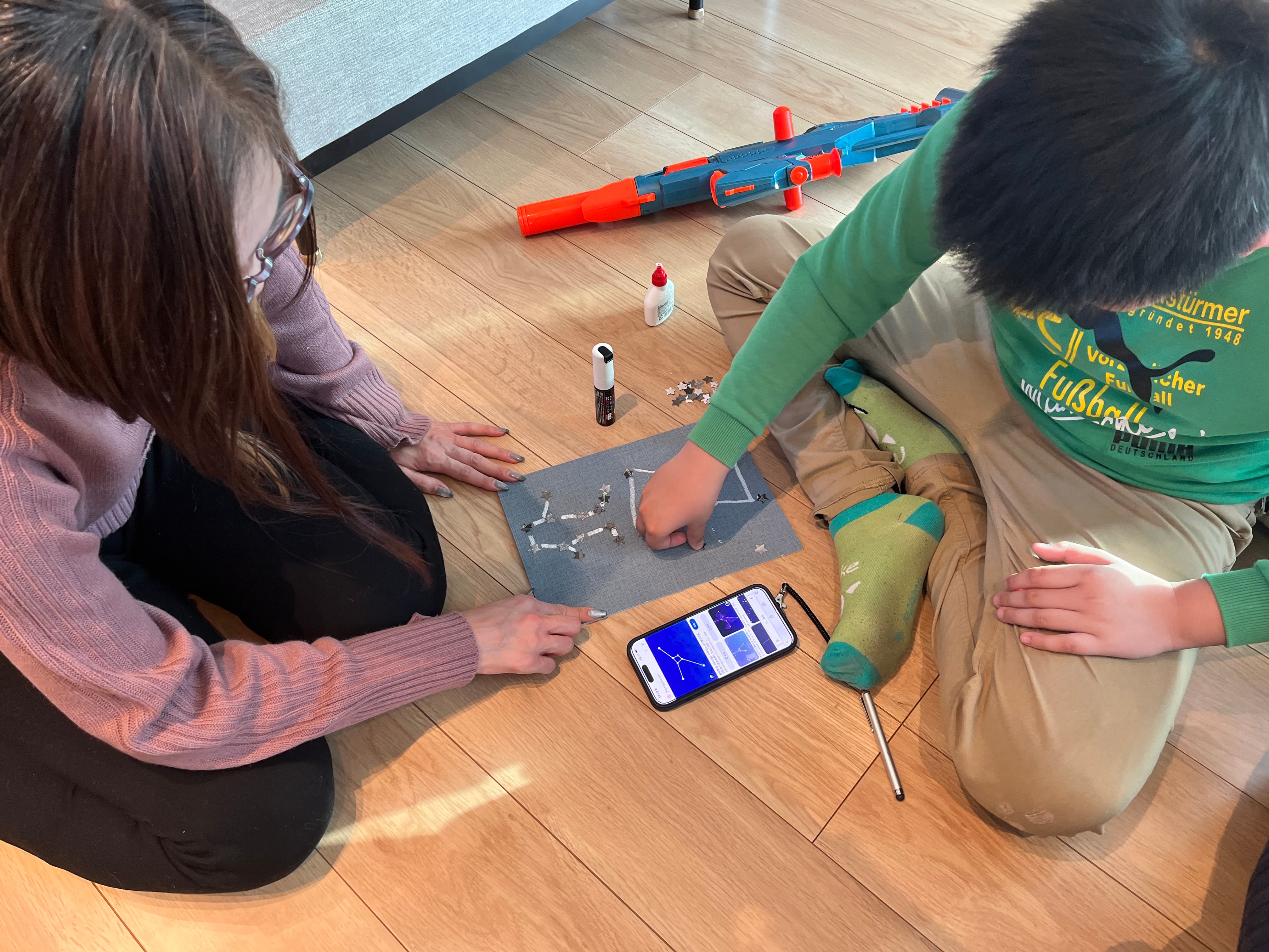 グレーのクッションフロアを夜空に見立てて、星座アートを作ってくれたお友達もいました!