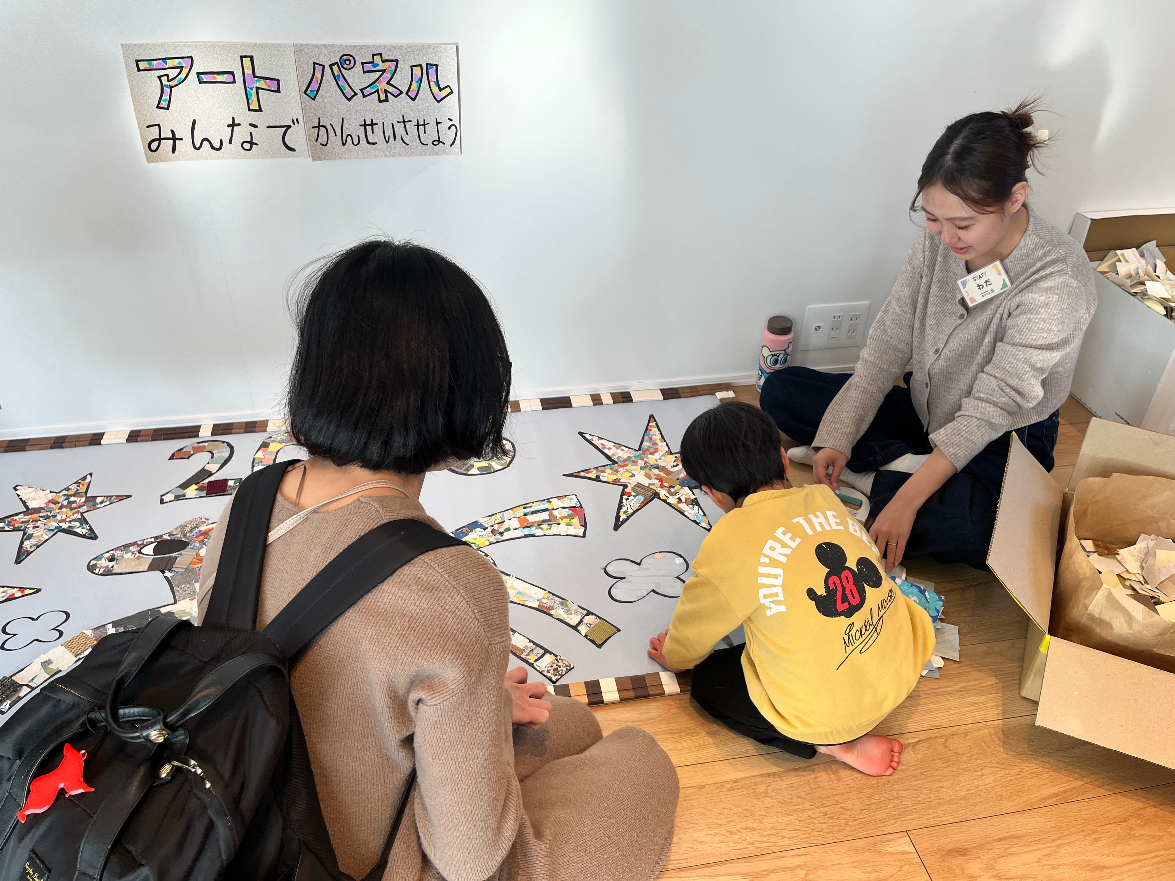 おおきなアートパネルも、みんなで少しずつぺたぺたして……