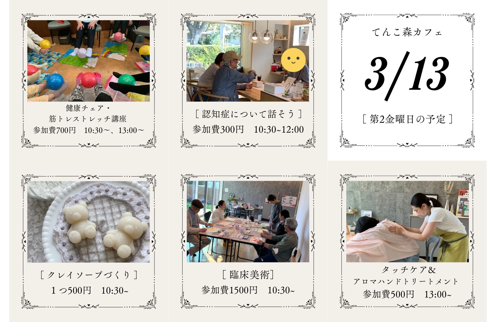 3/13(金)てんこ森カフェでは認知症カフェや初登場の健康チェア体操の他、様々なワークショップを用意しています♪
